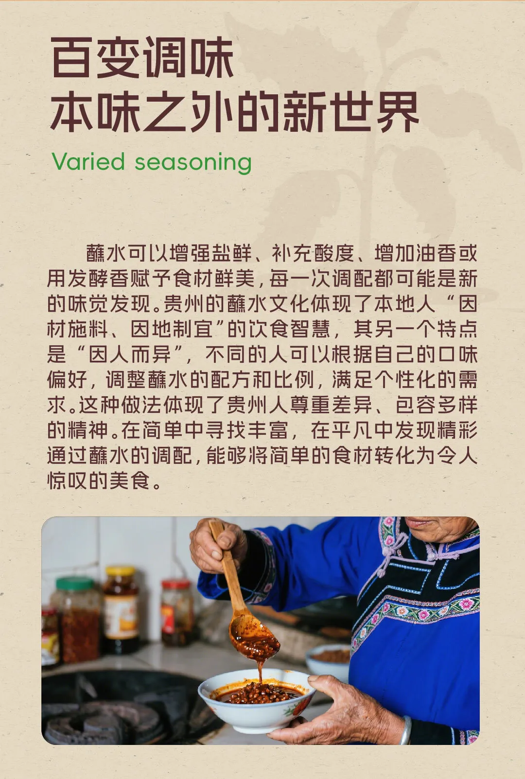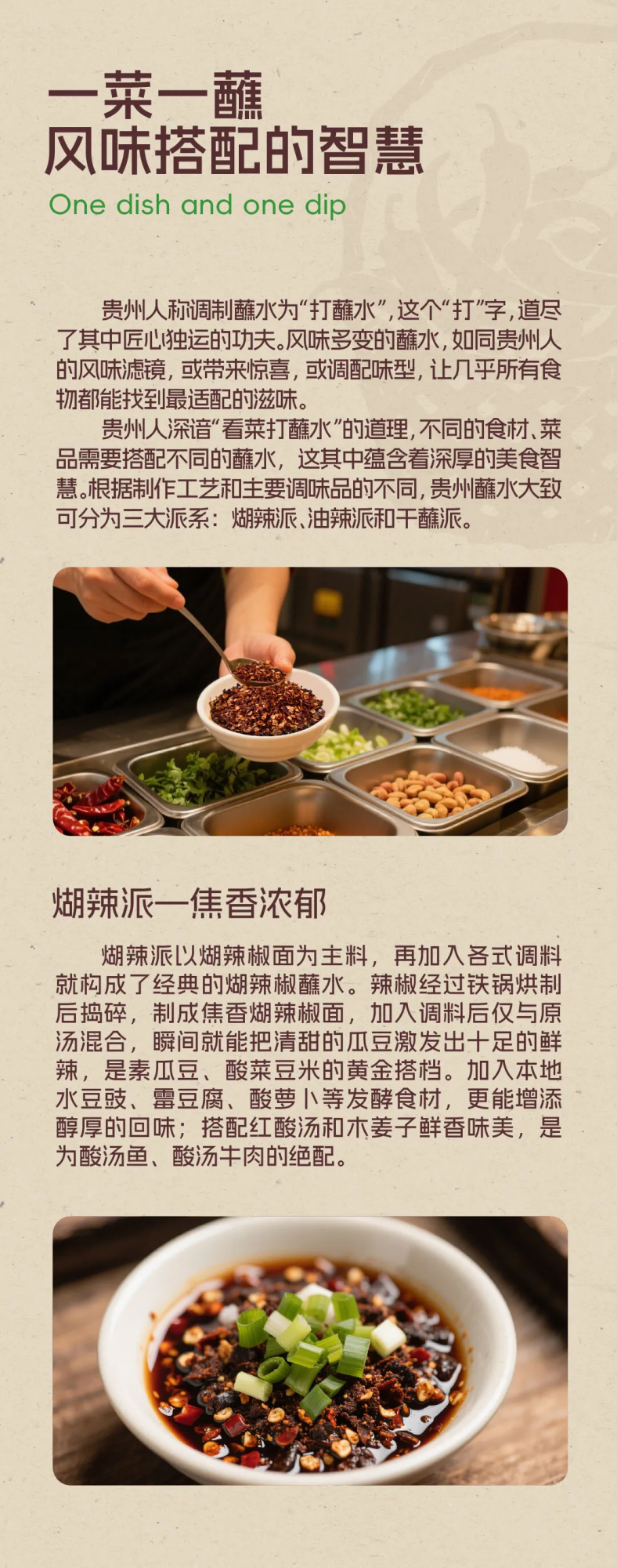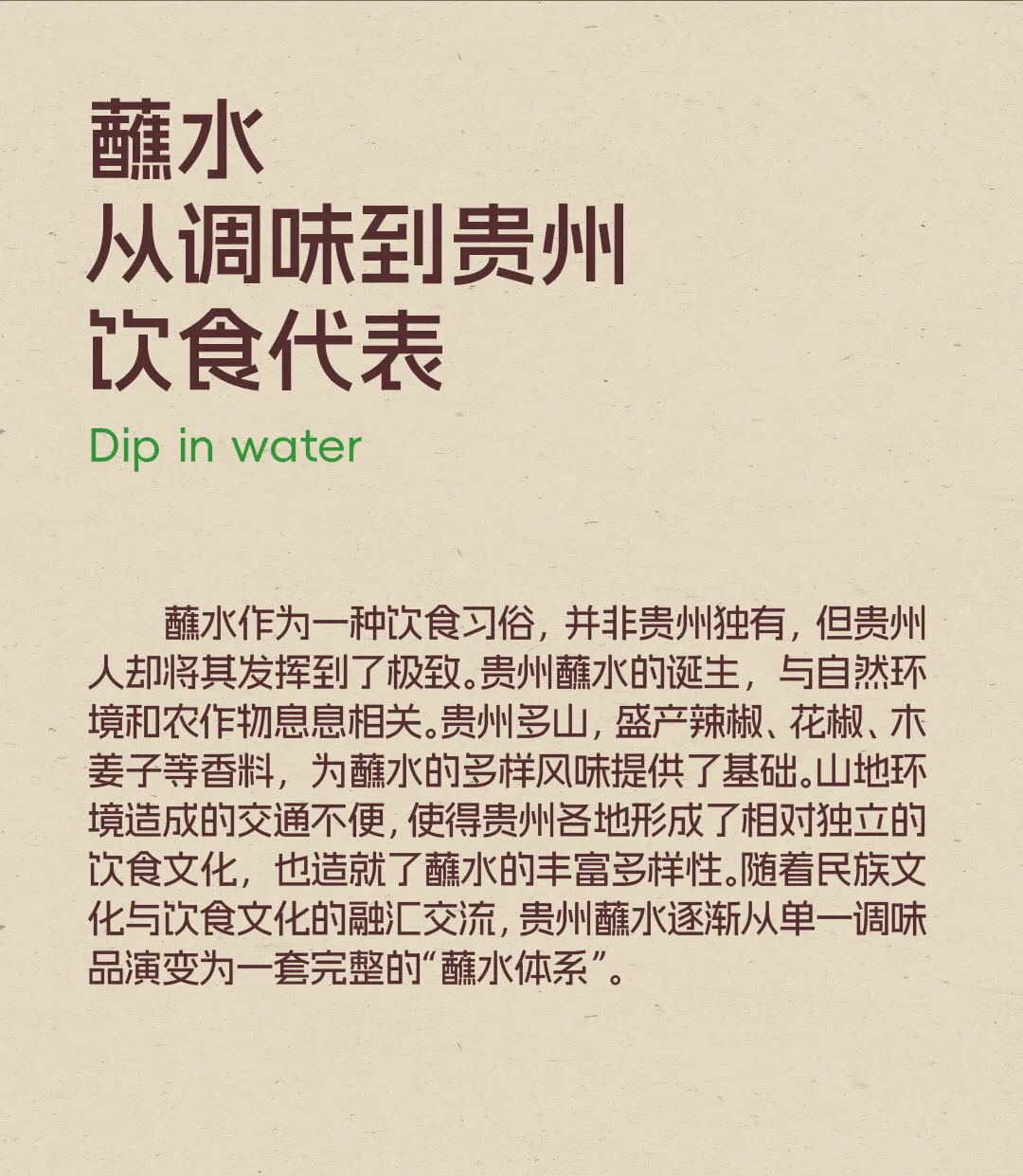 蘸水作为一种饮食习俗,并非贵州独有,但贵州人却将其发挥到了极致。贵州蘸水的诞生,与自然环境和农作物息息相关。贵州多山,盛产辣椒、花椒、木姜子等香料,为蘸水的多样风味提供了基础。山地环境造成的交通不便,使得贵州各地形成了相对独立的饮食文化,也造就了蘸水的丰富多样性。随着民族文化与饮食文化的融汇交流,贵州蘸水逐渐从单一调味...