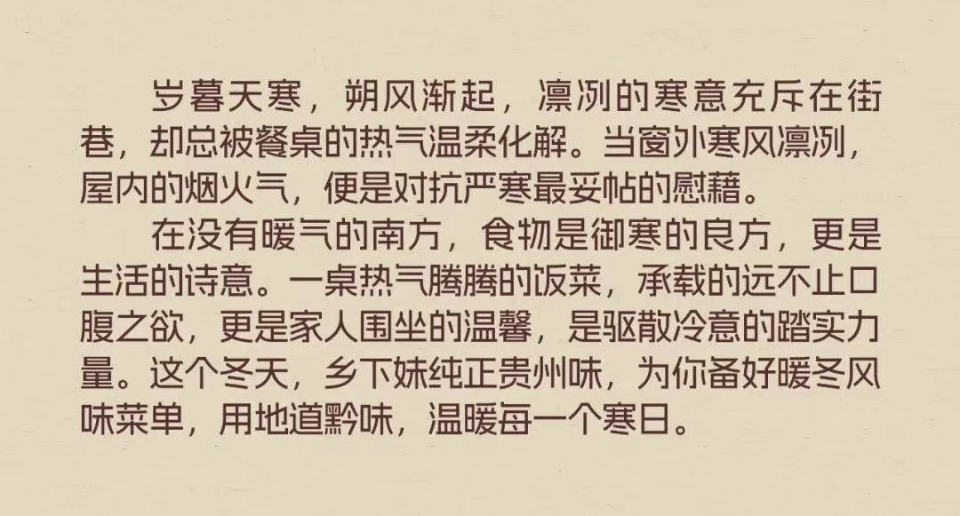 岁暮天寒,朔风渐起,凛冽的寒意充斥在街巷,却总被餐桌的热气温柔化解。当窗外寒风凛冽,屋内的烟火气,便是对抗严寒最妥帖的慰藉。 在没有暖气的南方,食物是御寒的良方,更是生活的诗意。一桌热气腾腾的饭菜,承载的远不止口腹之欲,更是家人围坐的温馨,是驱散冷意的踏实力量。这个冬天,乡下妹纯正贵州味,为你备好暖冬风味菜单,用地道...